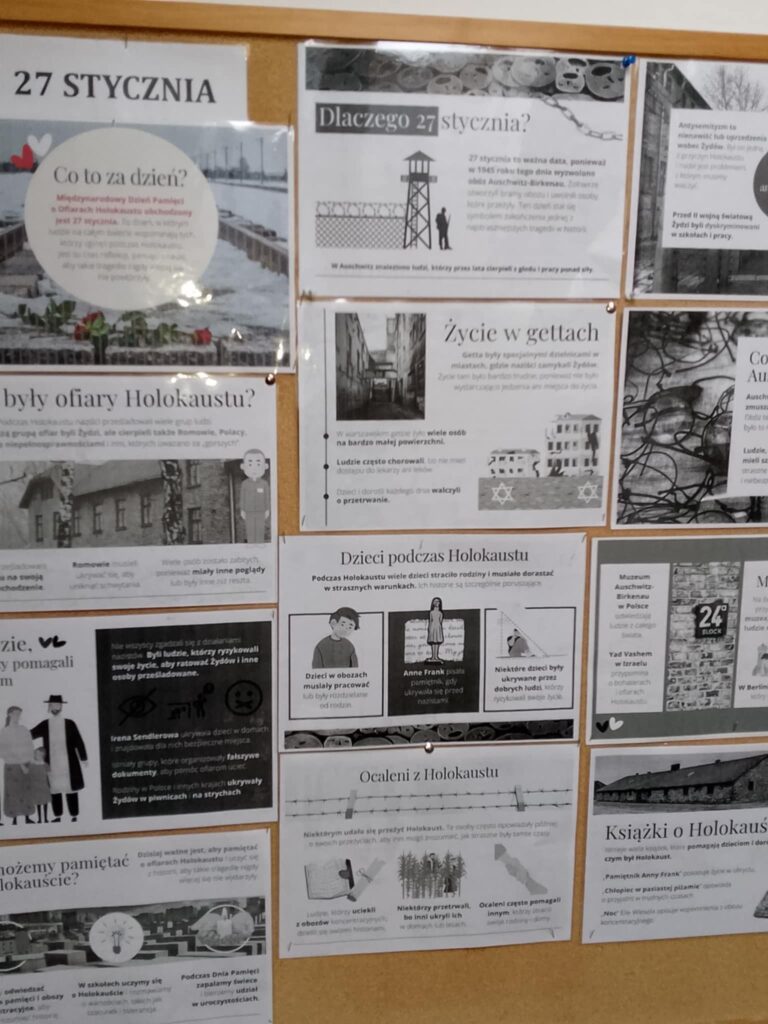 W 80 rocznicę wyzwolenia Auschwitz – Birkenau uczniowie stworzyli gazetkę tematyczną. Przy pracy wykorzystano laptop i laminarkę zakupioną w ramach programu #LaboratoriaPrzyszłości